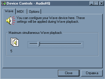 Простая утилитка, позволяющая настроить какие-то параметры звуковой карты. Например поставить количество одновременно проигрываемых Wave- файлов. Поставить можно до 32, но реально это не нужно. 5 файлов будет достаточно, если только Вы не "Advanced User".