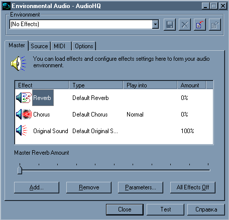 Это и есть прославленная имитация окружающей среды. С помощью Environmental Audio в реальном времени можно накладывать такие эффекты, как реверберация и другие. А если Вы не желаете возиться с параметрами, то выбирайте один из уже записанных пресетов для получения нужного эффекта. Можно одним движением мышки перенести слушателя в горы, концертный зал, пещеру, тоннель, на арену и даже под воду. Но также эти эффекты можно накладывать не только на звук с микрофона или компакт диска, а используя karaoke, изменять только один уровень, оставляя остальные не тронутыми. Можно полностью свести на нет начальный звук, или оставить от него каких-нибудь 20 процентов. Каждый параметр может быть настроен для получения нужного результата и сохранён в качестве новой настройки.