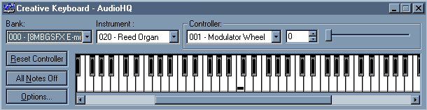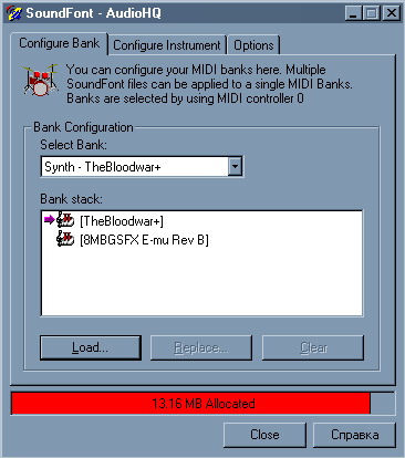 В закладке "Options" Вы можете выделить динамический участок памяти Вашего компьютера под хранение звуковых банков. Красная полоска внизу будет напоминать Вам о количестве занятой банками памяти. Для удобства программа не разрешит вам загружать более половины оперативной памяти (излюбленная привычка Creative- заботиться о нашей памяти). Выделив участок памяти под банки, Вы не навсегда лишаетесь этого объёма памяти, а лишь когда память понадобиться для хранения банков. Дело в том, что память выделяется динамически, но не больше указанного объёма. Если Вы профессионально работаете с MIDI, рекомендую вам сразу поставить объём памяти на максимум.