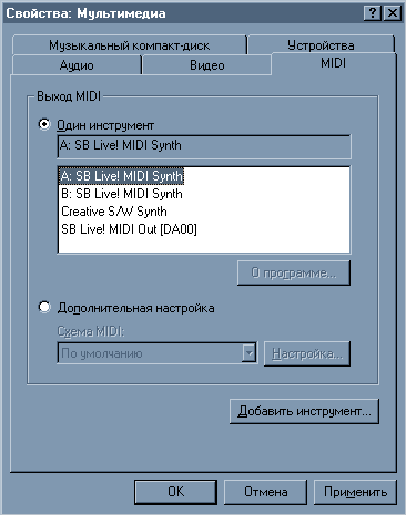 Прошу заметить, что он даёт довольно таки приличное качество. Даже очень хорошее для софтверного синтезатора. Я рекомендую использовать его для проигрывания старых миди. Таких, как поставляются в комплекте с Win 3.11/95/98/NT. Этот синтезатор не использует банки. SB Live! MIDI Out — это для внешних устройств, без которых включать его нет смысла.