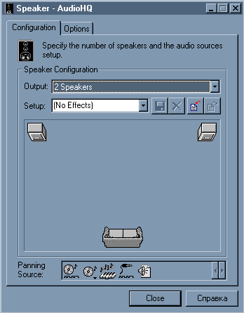 Это программа призвана помочь Вам настроить Вашу систему на оптимальное звучание. Выберите тип источников звука из списка. Затем включите какой-нибудь звук (аудио CD, например) и Drag&Drop-ните источник звука (иконка внизу) в ваше звуковое пространство. Еслу у Вас 4 колонки, то Вы можете перемещать источник звука по всему пространству. В закладке "Options" для каждого типа источников звука можно выбрать расширения объёма звука с помощью Creative Multi-Speaker Surround (CMSS). Для 2-х колонок, Hometheater и наушников это- Stereo Enchancement Mode, для 4 колонок -Movie Mode.