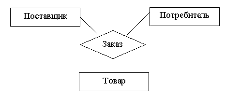 Если связь соединяет две сущности, она называется бинарной. Связь может соединять более двух сущностей, например, связь, соединяющая три сущности, называется тернарной (рис. 6.6). Обратите внимание, что здесь «Заказ» – не сущность, а связь, как равноправный с сущностями элемент модели. Далее на уровне логических и, тем более, физических моделей реляционных БД «Заказ» превратится в реляционную таблицу.