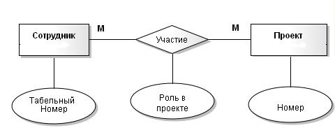 Связь «многие ко многим» может иметь собственные свойства, характеризующие взаимодействие сущностей (например, связи УЧАСТИЕ и РЕАЛИЗАЦИЯ ПРОЕКТА на рис. 5.5). В этом случае для изображения связи используется графический элемент, соответствующий слабой сущности. Прямоугольник сущности присоединяется к линии связи (или к ромбу в случае n-арной связи) пунктирной линией.