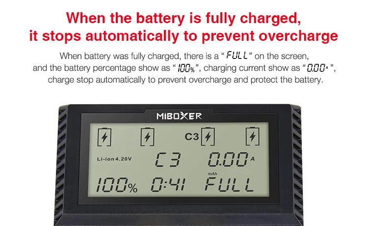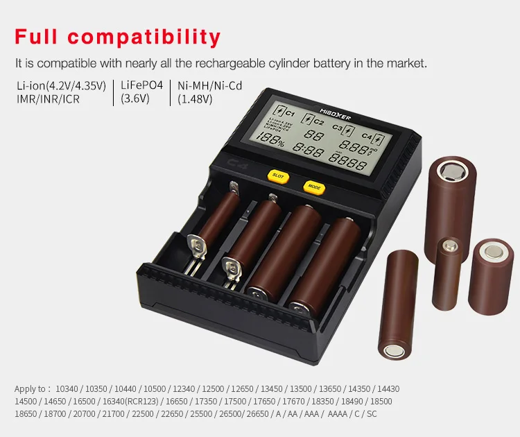 C4 имеет различные функции и режимы зарядки в соответствии с различными типами зарядки аккумулятора. он использует стандартный режим зарядки литий-ионного аккумулятора при работе с литий-ионными/IMR/INR/ICR/LiFePO4 аккумуляторами; Используйте режим полной зарядки для никель-металл-гидридных, никель-кадмиевых аккумуляторов.